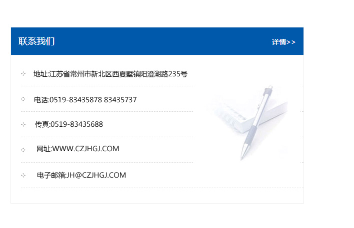 地址:常州市新北區友邦商務大廈1幢16、17層  電話:0519-85101652  傳真:0519-85112595  郵編:213022  網址:www_cz-jiayue_cn.lskj668.com  郵箱:xiajifengaa@163.com